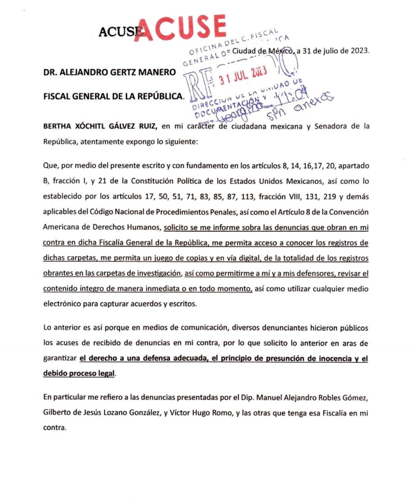 Solicita información sobre las presuntas denuncias en su contra. La aspirante a responsable de la construcción del Frente Amplio por México, Xóchitl Gálvez Ruiz, se