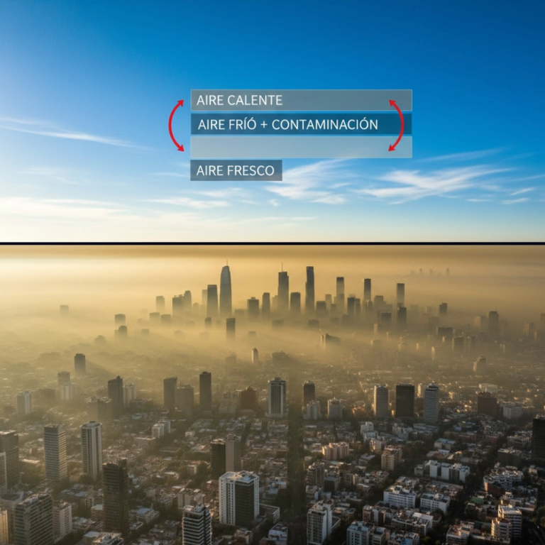 Este fenómeno ocurre cuando una capa de aire caliente se posiciona sobre el aire frío cercano al suelo. Esto genera un efecto de “tapón” atmosférico que atrapa las partículas contaminantes e impide que se eleven, incrementando su concentración en las zonas habitables de la ciudad.