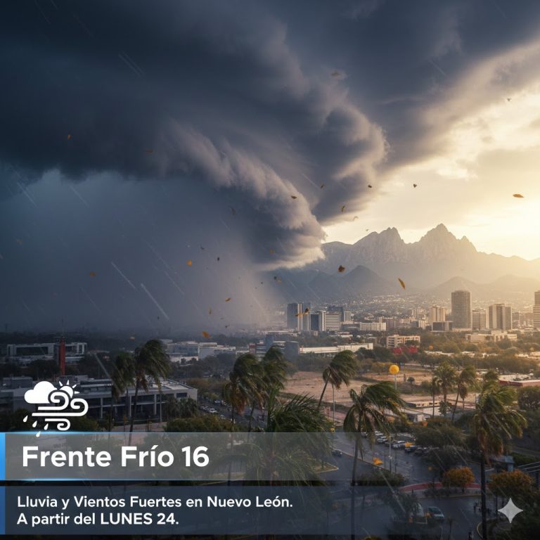 MONTERREY, NL. El Servicio Meteorológico Nacional (SMN) de Conagua informó sobre la llegada del frente frío número 16 al noreste del país, el cual provocará chubascos y vientos fuertes en Nuevo León y Tamaulipas a partir del lunes 24 de noviembre.